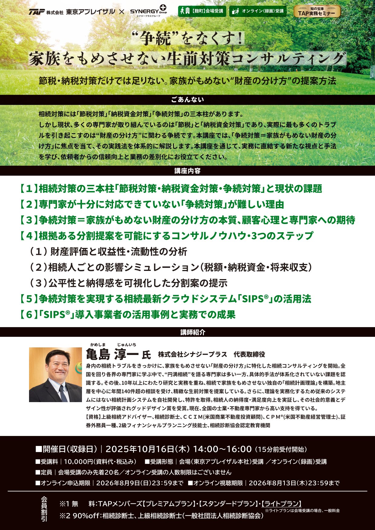 本セミナーでは、その争続対策=家族をもめさせない財産の分け方 に焦点を当て、実務に直結する具体的な提案の手法や、最新クラウドシステム SIPS® の活用法についても解説いたします。