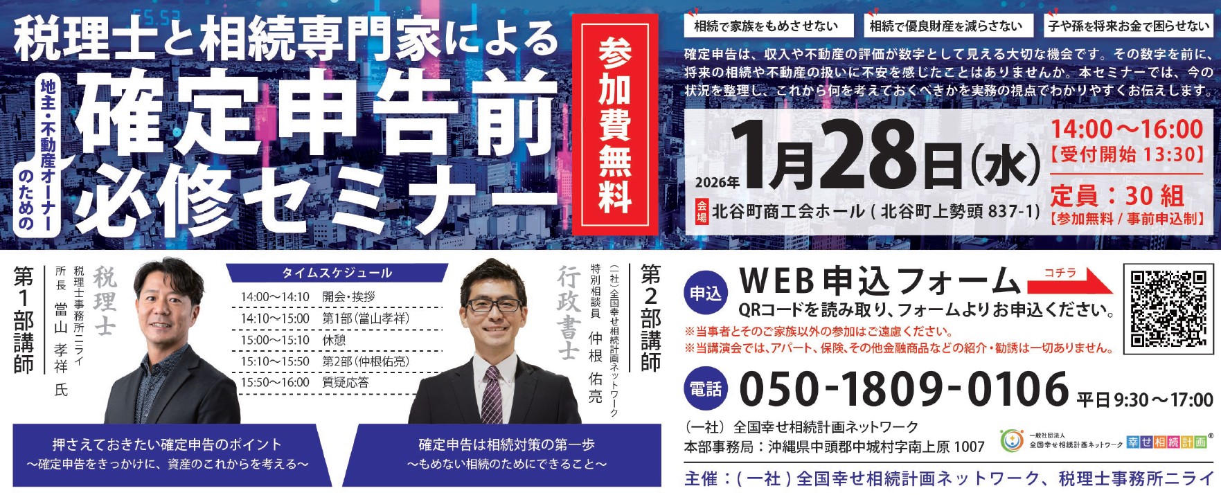 【1/28(水)沖縄北谷】確定申告前 相続と不動産セミナー[税理士・行政書士]