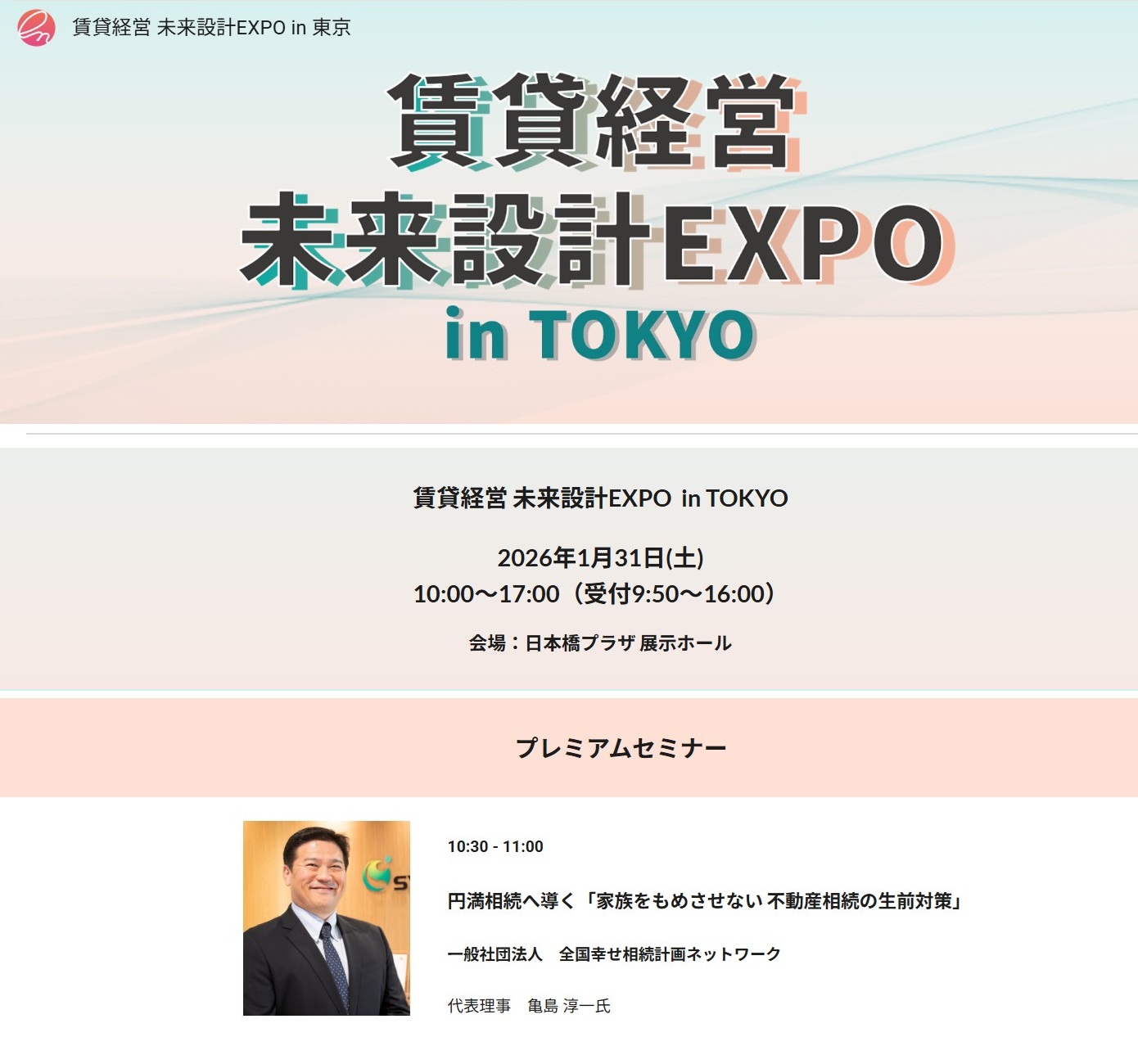 当社が代表・事務局を務める一般社団法人 全国幸せ相続計画ネットワークは、東京日本橋にて開催される「賃貸経営 未来設計EXPO in TOKYO」にブース出展いたします。