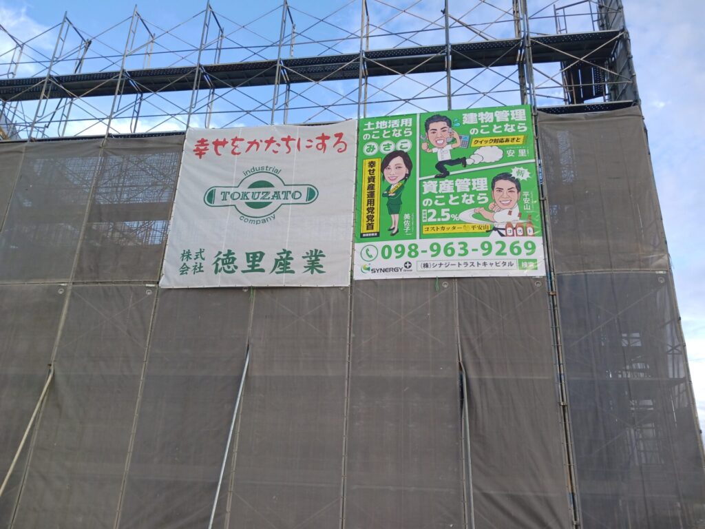 「お待たせしました、幸せになれる看板」シリーズ最新作が、読谷の新築物件にてお目見えです!今回はインパクト抜群の垂れ幕スタイルで、見る人すべてに笑顔と希望を届けます。
