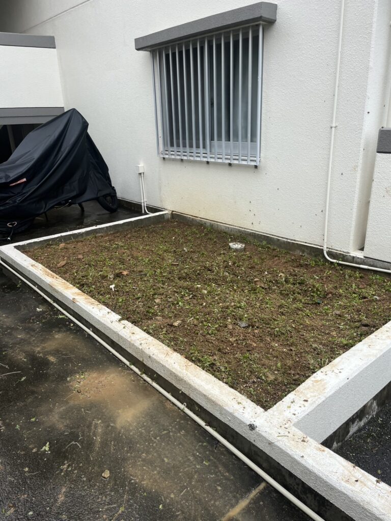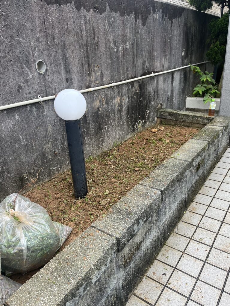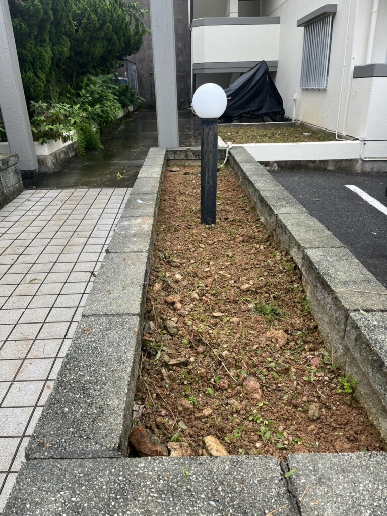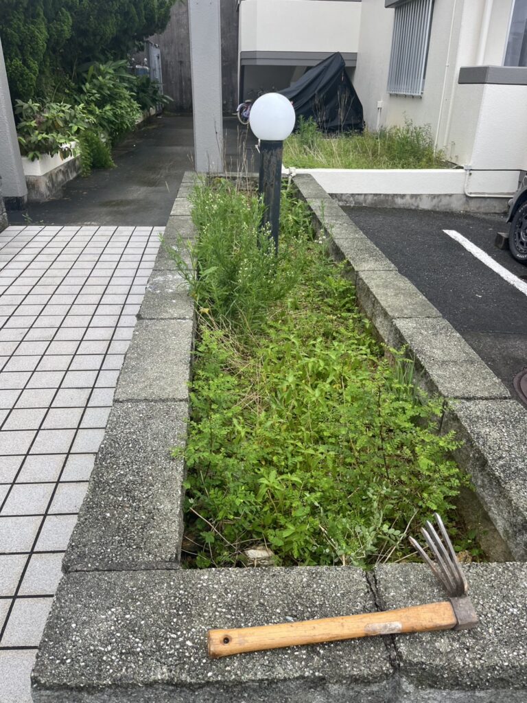 今回、新たに管理を任せていただいた物件において、しばらく手入れがされていなかった花壇の草刈りと草抜きを実施しました。長く放置されていたことで雑草が繁茂し、建物全体の印象にも影響を与えていました。